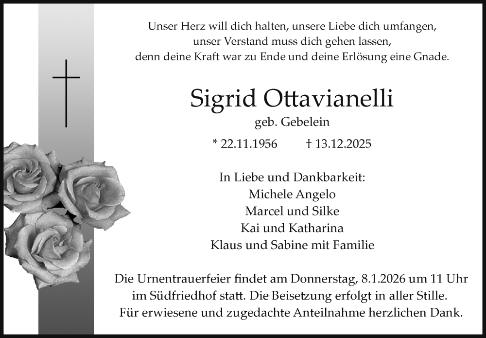Hier finden Sie alle Traueranzeigen aus der Zeitung, die bisher für Sigrid Ottavianelli erschienen sind. Weitere Traueranzeigen, die in der Zeitung erscheinen, werden hier ebenfalls aufgelistet