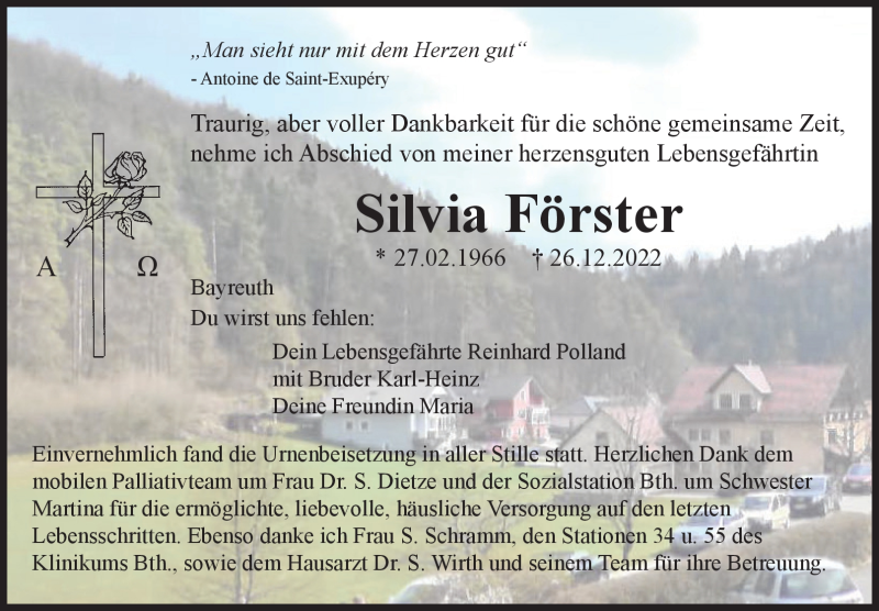 Hier finden Sie alle Traueranzeigen aus der Zeitung, die bisher für Silvia Förster erschienen sind. Weitere Traueranzeigen, die in der Zeitung erscheinen, werden hier ebenfalls aufgelistet