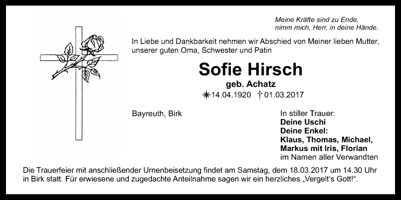 Hier finden Sie alle Traueranzeigen aus der Zeitung, die bisher für Sofie Hirsch erschienen sind. Weitere Traueranzeigen, die in der Zeitung erscheinen, werden hier ebenfalls aufgelistet