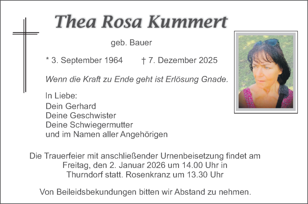 Hier finden Sie alle Traueranzeigen aus der Zeitung, die bisher für Thea Kummert erschienen sind. Weitere Traueranzeigen, die in der Zeitung erscheinen, werden hier ebenfalls aufgelistet