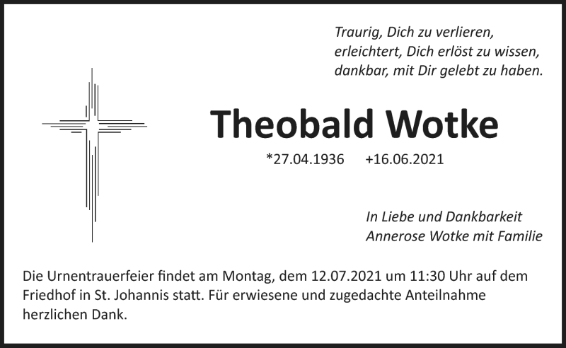 Hier finden Sie alle Traueranzeigen aus der Zeitung, die bisher für Theobbald Wotke erschienen sind. Weitere Traueranzeigen, die in der Zeitung erscheinen, werden hier ebenfalls aufgelistet