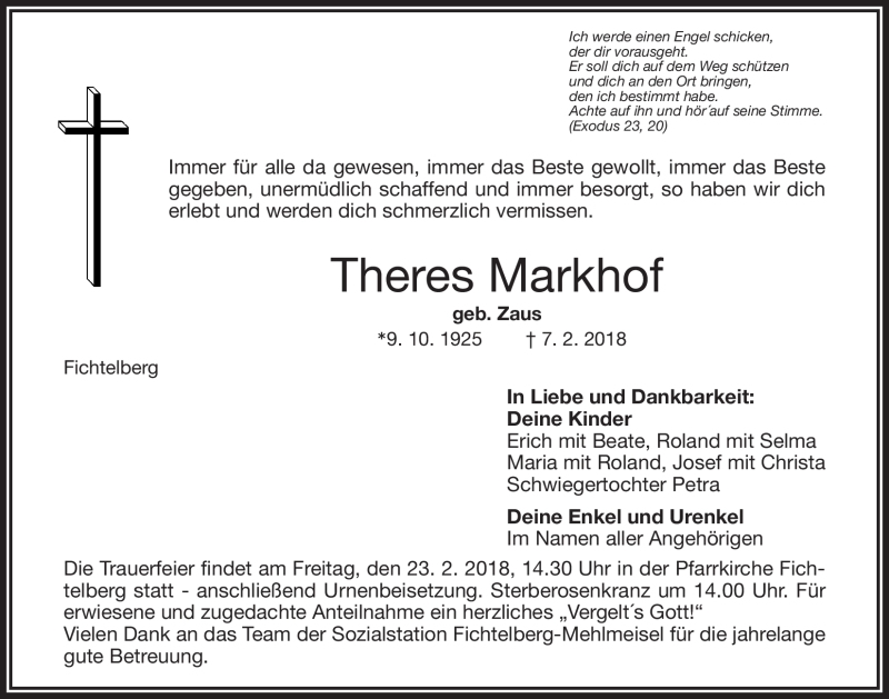 Hier finden Sie alle Traueranzeigen aus der Zeitung, die bisher für Theres Markhof erschienen sind. Weitere Traueranzeigen, die in der Zeitung erscheinen, werden hier ebenfalls aufgelistet