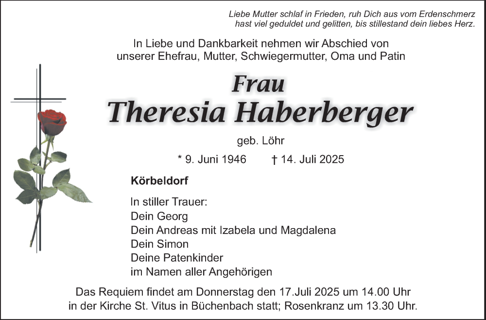 Hier finden Sie alle Traueranzeigen aus der Zeitung, die bisher für Theresia Haberberger erschienen sind. Weitere Traueranzeigen, die in der Zeitung erscheinen, werden hier ebenfalls aufgelistet