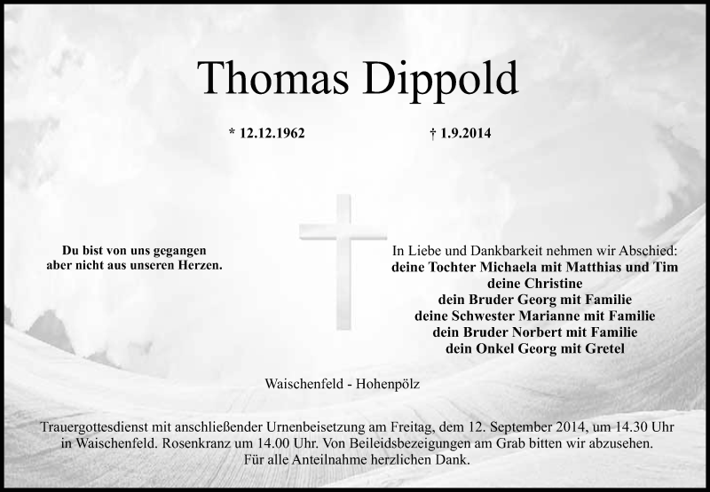 Hier finden Sie alle Traueranzeigen aus der Zeitung, die bisher für Thomas Dippold erschienen sind. Weitere Traueranzeigen, die in der Zeitung erscheinen, werden hier ebenfalls aufgelistet