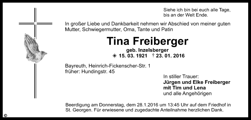 Hier finden Sie alle Traueranzeigen aus der Zeitung, die bisher für Tina Freiberger erschienen sind. Weitere Traueranzeigen, die in der Zeitung erscheinen, werden hier ebenfalls aufgelistet