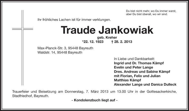 Hier finden Sie alle Traueranzeigen aus der Zeitung, die bisher für Traude Jankowiak erschienen sind. Weitere Traueranzeigen, die in der Zeitung erscheinen, werden hier ebenfalls aufgelistet