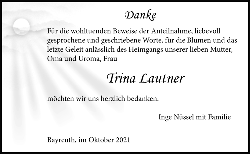 Hier finden Sie alle Traueranzeigen aus der Zeitung, die bisher für Trina Lautner erschienen sind. Weitere Traueranzeigen, die in der Zeitung erscheinen, werden hier ebenfalls aufgelistet