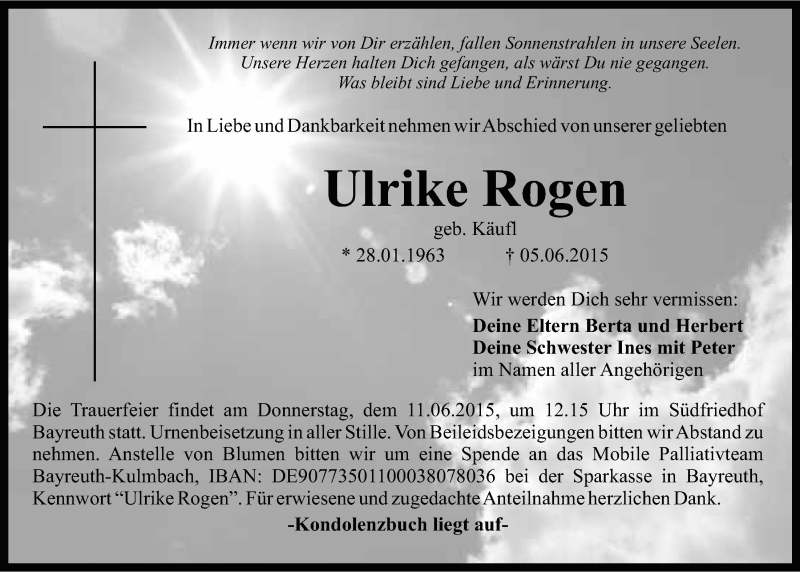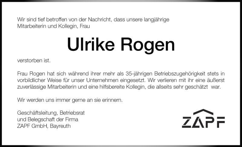 Hier finden Sie alle Traueranzeigen aus der Zeitung, die bisher für Ulrike Rogen erschienen sind. Weitere Traueranzeigen, die in der Zeitung erscheinen, werden hier ebenfalls aufgelistet