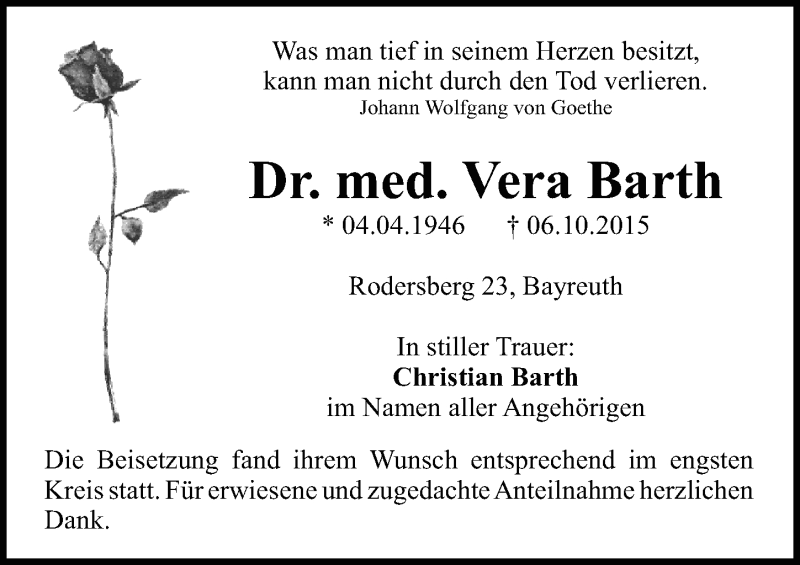 Hier finden Sie alle Traueranzeigen aus der Zeitung, die bisher für Vera Barth erschienen sind. Weitere Traueranzeigen, die in der Zeitung erscheinen, werden hier ebenfalls aufgelistet
