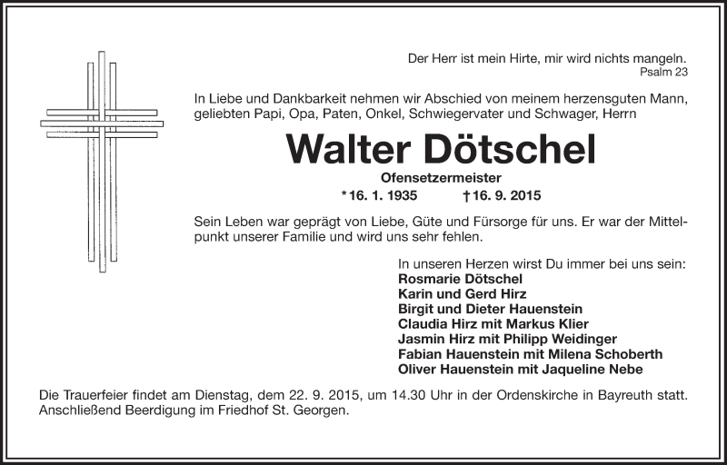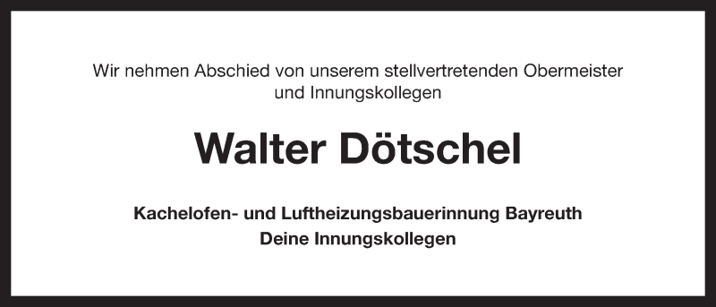 Hier finden Sie alle Traueranzeigen aus der Zeitung, die bisher für Walter Dötschel erschienen sind. Weitere Traueranzeigen, die in der Zeitung erscheinen, werden hier ebenfalls aufgelistet