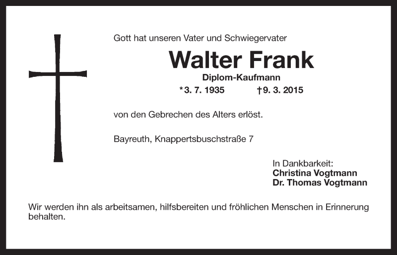Hier finden Sie alle Traueranzeigen aus der Zeitung, die bisher für Walter Frank erschienen sind. Weitere Traueranzeigen, die in der Zeitung erscheinen, werden hier ebenfalls aufgelistet