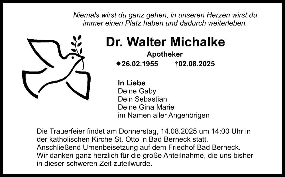 Hier finden Sie alle Traueranzeigen aus der Zeitung, die bisher für Walter Michalke erschienen sind. Weitere Traueranzeigen, die in der Zeitung erscheinen, werden hier ebenfalls aufgelistet