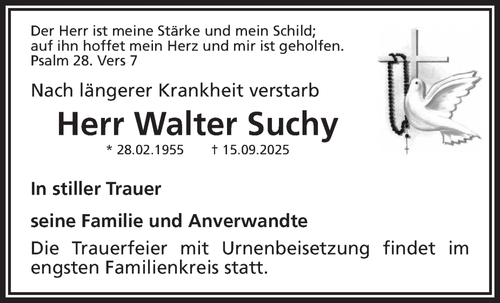 Hier finden Sie alle Traueranzeigen aus der Zeitung, die bisher für Walter Suchy erschienen sind. Weitere Traueranzeigen, die in der Zeitung erscheinen, werden hier ebenfalls aufgelistet