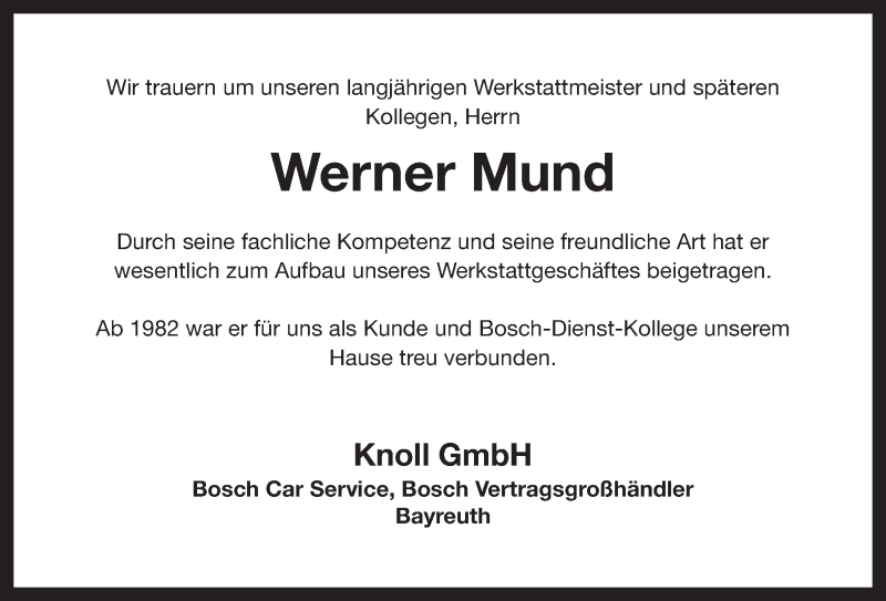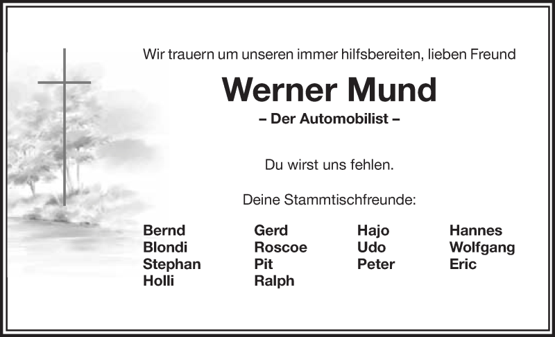 Hier finden Sie alle Traueranzeigen aus der Zeitung, die bisher für Werner Mund erschienen sind. Weitere Traueranzeigen, die in der Zeitung erscheinen, werden hier ebenfalls aufgelistet