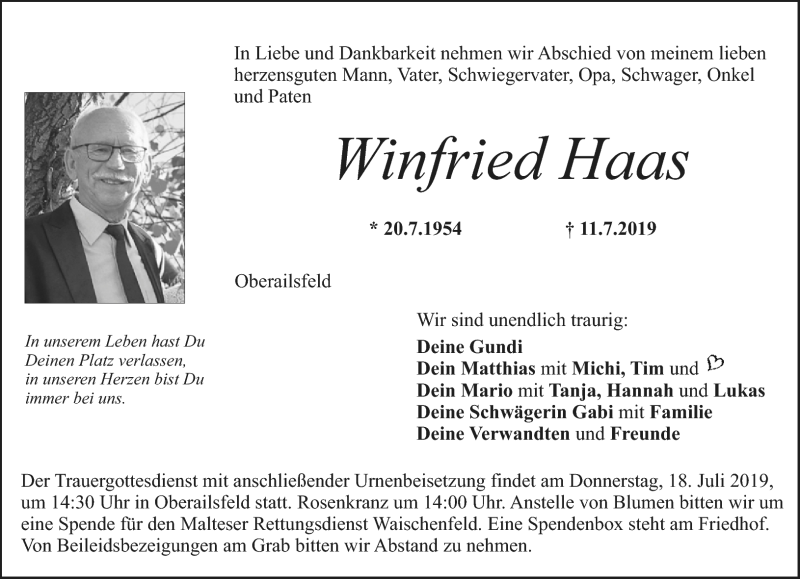 Hier finden Sie alle Traueranzeigen aus der Zeitung, die bisher für Winfried Haas erschienen sind. Weitere Traueranzeigen, die in der Zeitung erscheinen, werden hier ebenfalls aufgelistet