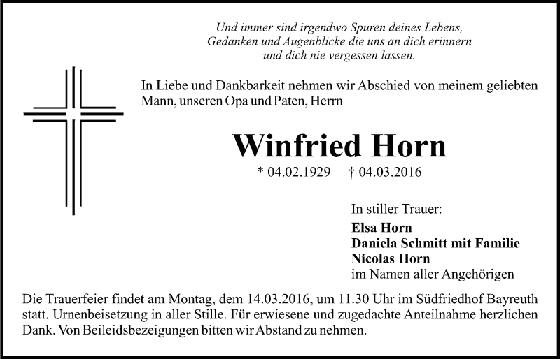 Hier finden Sie alle Traueranzeigen aus der Zeitung, die bisher für Winfried Horn erschienen sind. Weitere Traueranzeigen, die in der Zeitung erscheinen, werden hier ebenfalls aufgelistet