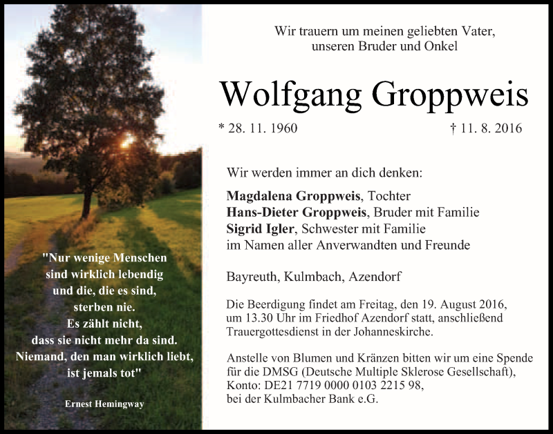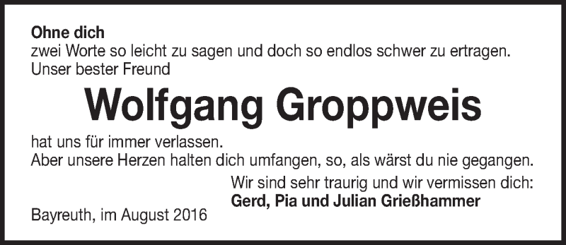 Hier finden Sie alle Traueranzeigen aus der Zeitung, die bisher für Wolfgang Groppweis erschienen sind. Weitere Traueranzeigen, die in der Zeitung erscheinen, werden hier ebenfalls aufgelistet